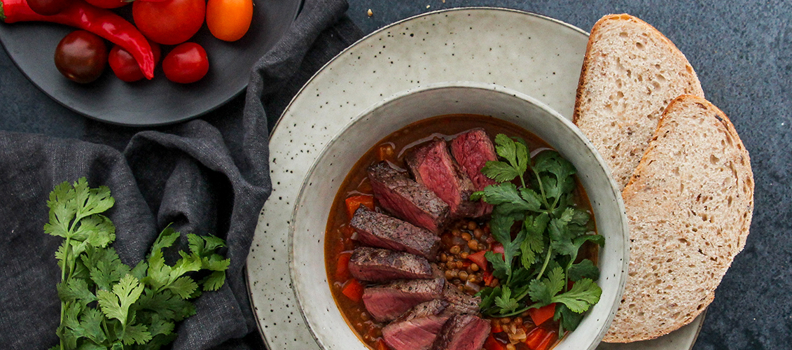Slice the medallions across the grain. Spoon the lentil stew into bowls, top with sliced medallions and finish with the chopped cilantro.