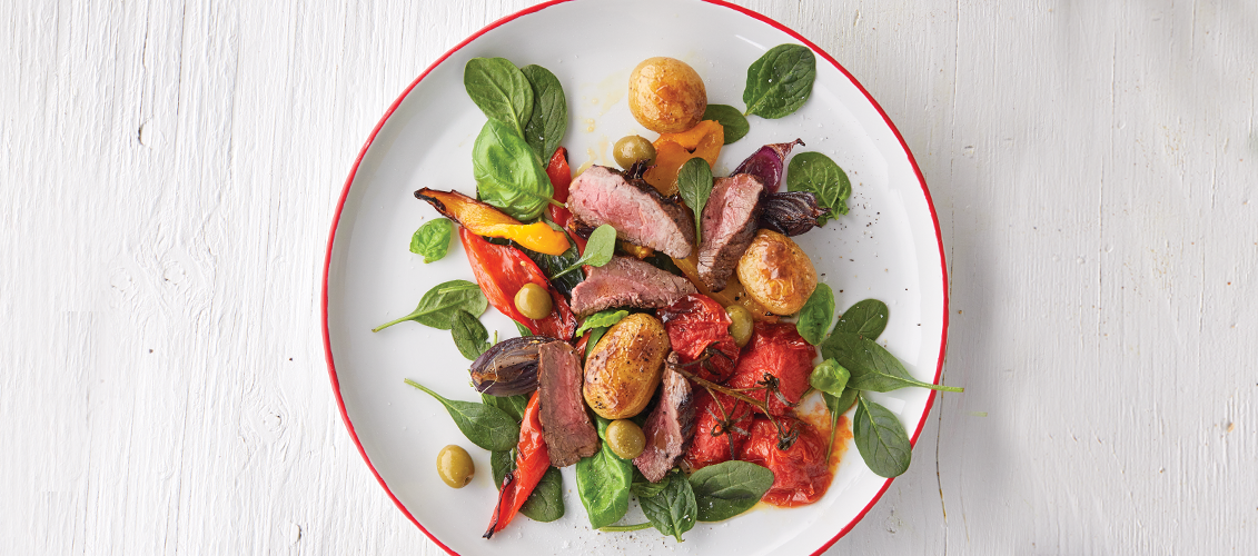 Remove the venison from the packaging and set aside to rest for 5 minutes. Heat a pan to medium-high and cook for 2-3 minutes on each side then set aside to rest for 5 minutes. Thickly slice and add to the tray of baked vegetables.