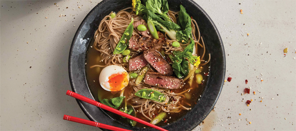 Place the choi sum and edamame beans in the ginger broth and bring to a simmer for 1-2 minutes to soften. Place a portion of warm soba noodles in the bottom of each serving bowl. Using a slotted spoon, place even portions of poached choi sum and edamame beans on each bowl, add a few snow peas and pour the remaining miso broth over the top. Add sliced Beef Rib Eye Steaks, and the soft-boiled eggs. Sprinkle with the spring onion slices, sesame seeds, chilli flakes and pepper. Serve warm.