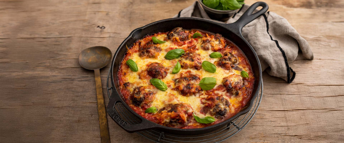 Heat extra olive oil in a frying pan over medium-high heat. Brown meatballs for 3-4 minutes, tossing frequently for even browning. Place in a large ovenproof dish.