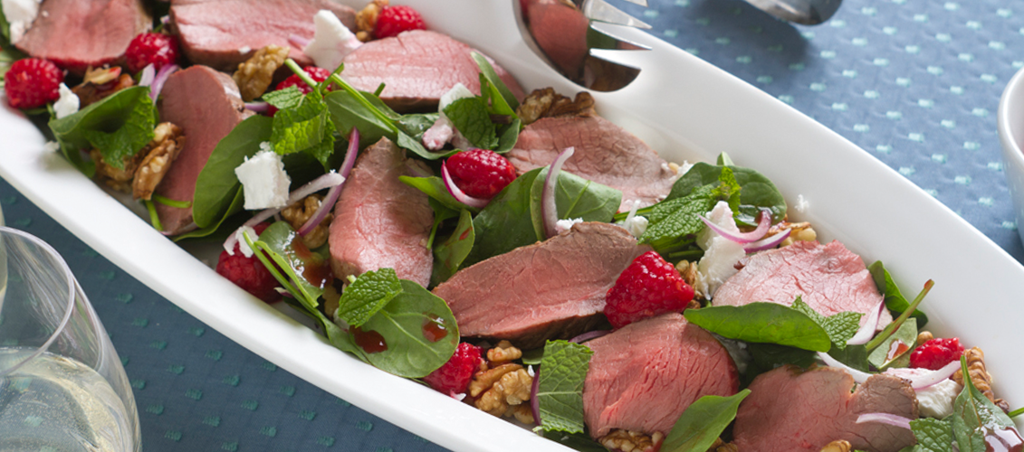 Arrange the spinach leaves, onion, goat's cheese, walnuts, and mint onto a serving platter. Slice rounds of lamb through the middle of the medallions and place on the salad. Drizzle over the raspberry vinegar and top with raspberries.