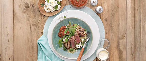 We recommend slicing lamb across the grain and serve over a vegetable couscous. Drizzle with remaining marinade for extra flavor, and garnish with crumbled feta.