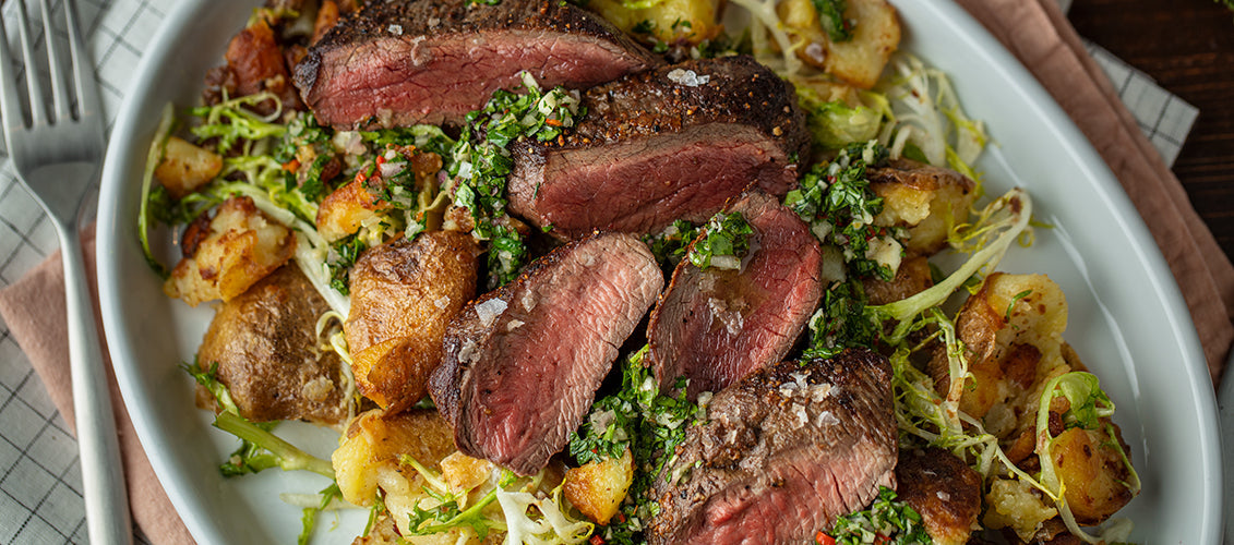 Scatter the crispy potato salad on a platter, place the steaks on top, and garnish with a drizzle of chimichurri. Serve warm with a bowl of the remaining chimichurri.