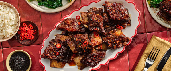 Cooked Beef Short Ribs on board with a plate of sauce at the side
